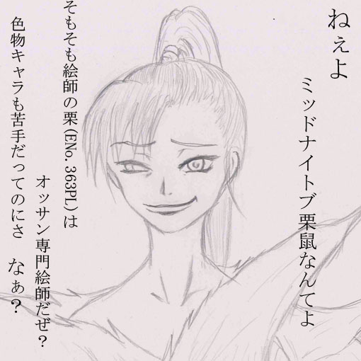 なんだかこれだけじゃ寂しいので、前日にノリで描いてみて「やっぱ俺には女性キャラ無理!」と悟らせた、適当な女体化もろこしに挑発的なセリフ喋らせたイラストを追加。